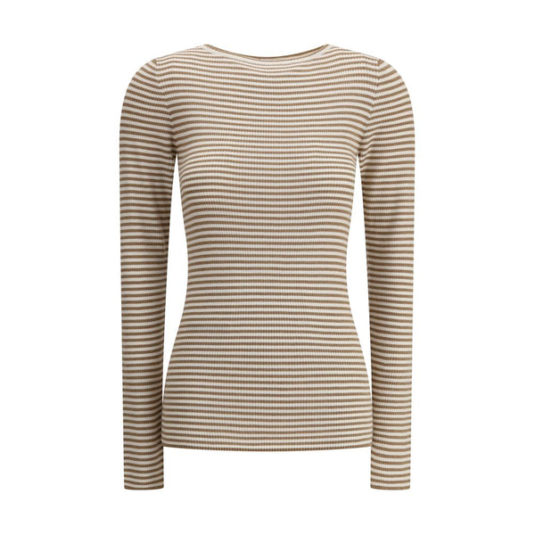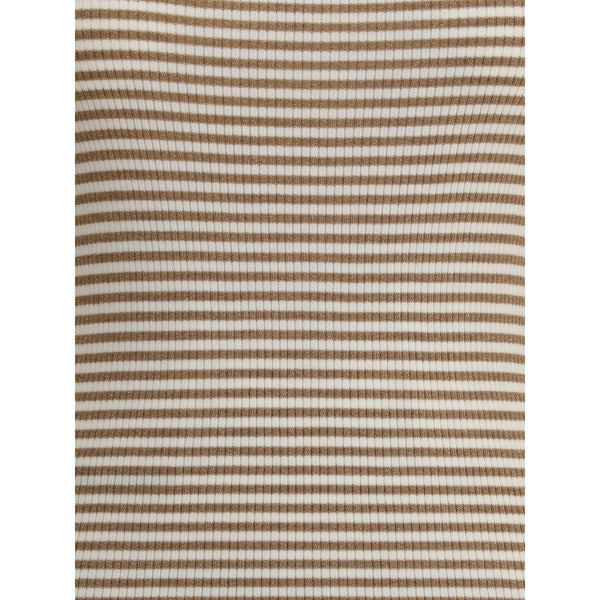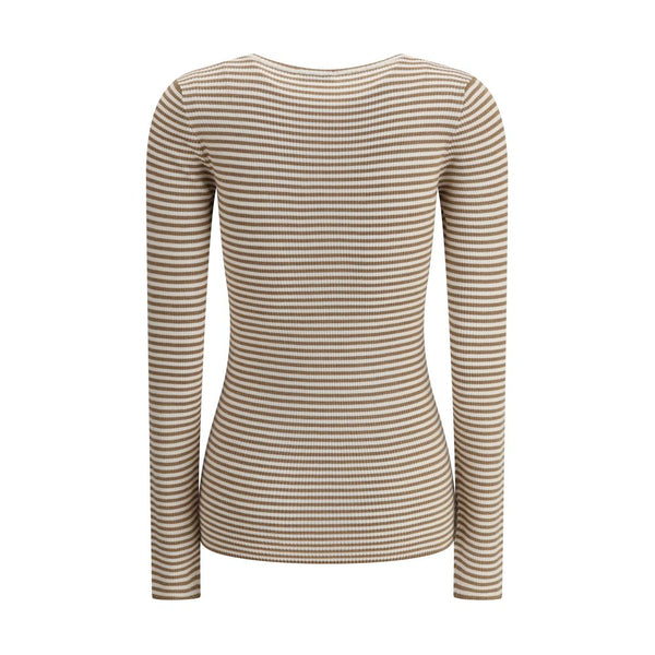 Cashmere Long Sleeve Jersey by Brunello Cucinelli is an elegant and luxurious garment. The crew neck offers a classic silhouette, while the ribbed design adds refined texture. The two-tone striped pattern lends a modern, dynamic touch, and the slim fit elegantly accentuates the figure.