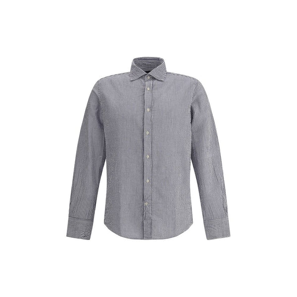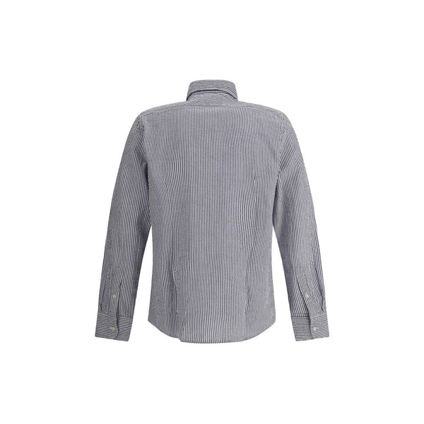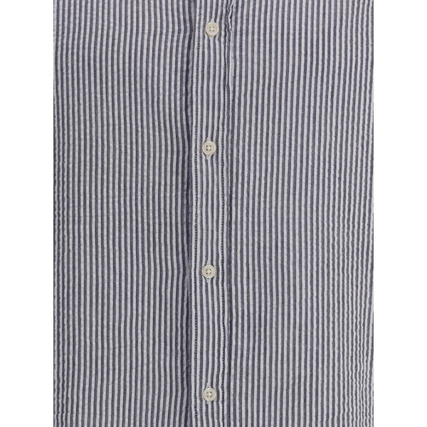 Cotton Seersucker Shirt by Deperlu, classic collar, front button closure, elastic fabric, all-over repeated stripe pattern, regular fit.