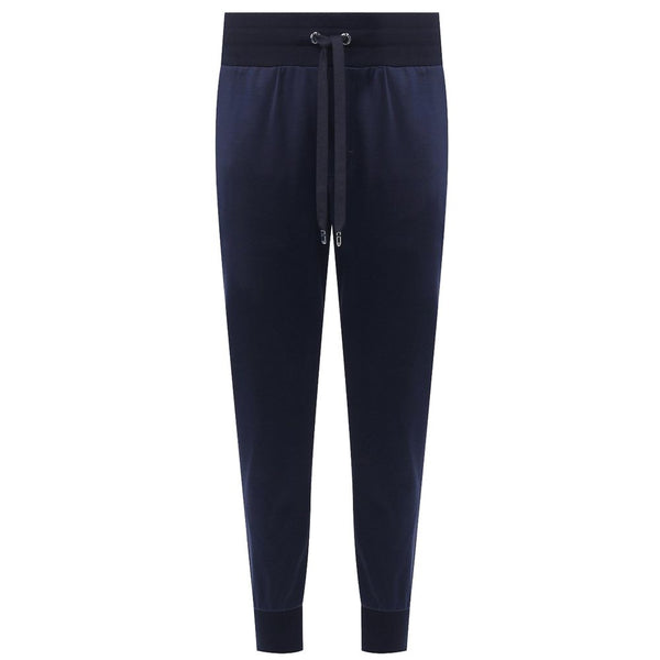 Elevate your wardrobe with these Dolce & Gabbana trousers, a seamless blend of luxury and comfort. Crafted from a premium silk, cotton and nylon blend, these pants are a testament to Italian craftsmanship. Defined by their easy drawstring waist, ribbed elasticated ankles, and practical pocket placement with two side pockets and one at the back, these blue trousers are highlighted by the sophisticated embroidered logo that adds a stamp of designer credibility to your casual ensemble. Dare to stand out in Dolce & Gabbana’s blend of timeless elegance and modern design.