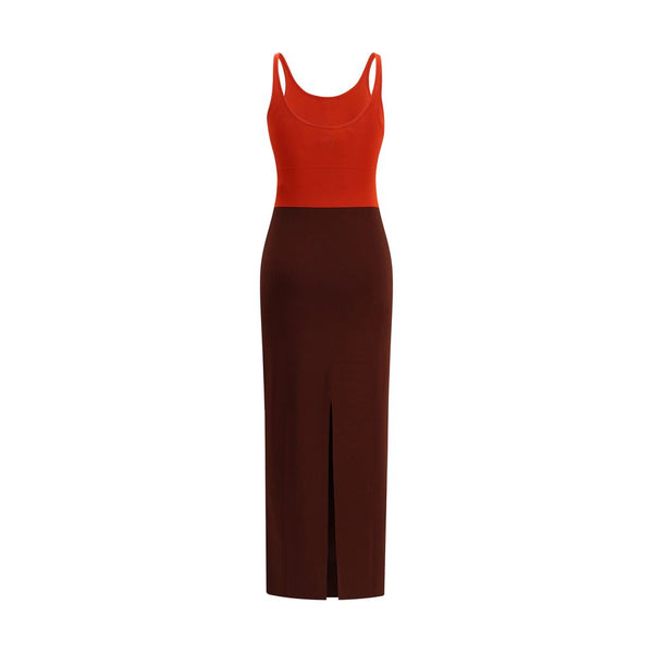 Fendi’s long knit Dress features a fitted silhouette and sleeveless design with thin straps and a wide round neckline. Made of viscose yarn with a color-block pattern, it combines elegance and modernity in a sleek, feminine silhouette.