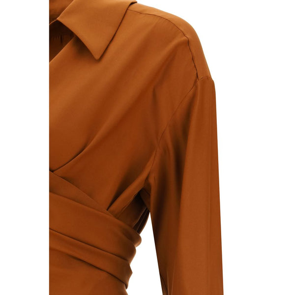 Silk Sabinas Shirt by Gauge81, low collar, monochrome cropped front design, front closure with invisible hooks, round side slits, adjustable cuffs with iconic brand signature engraved buttons.